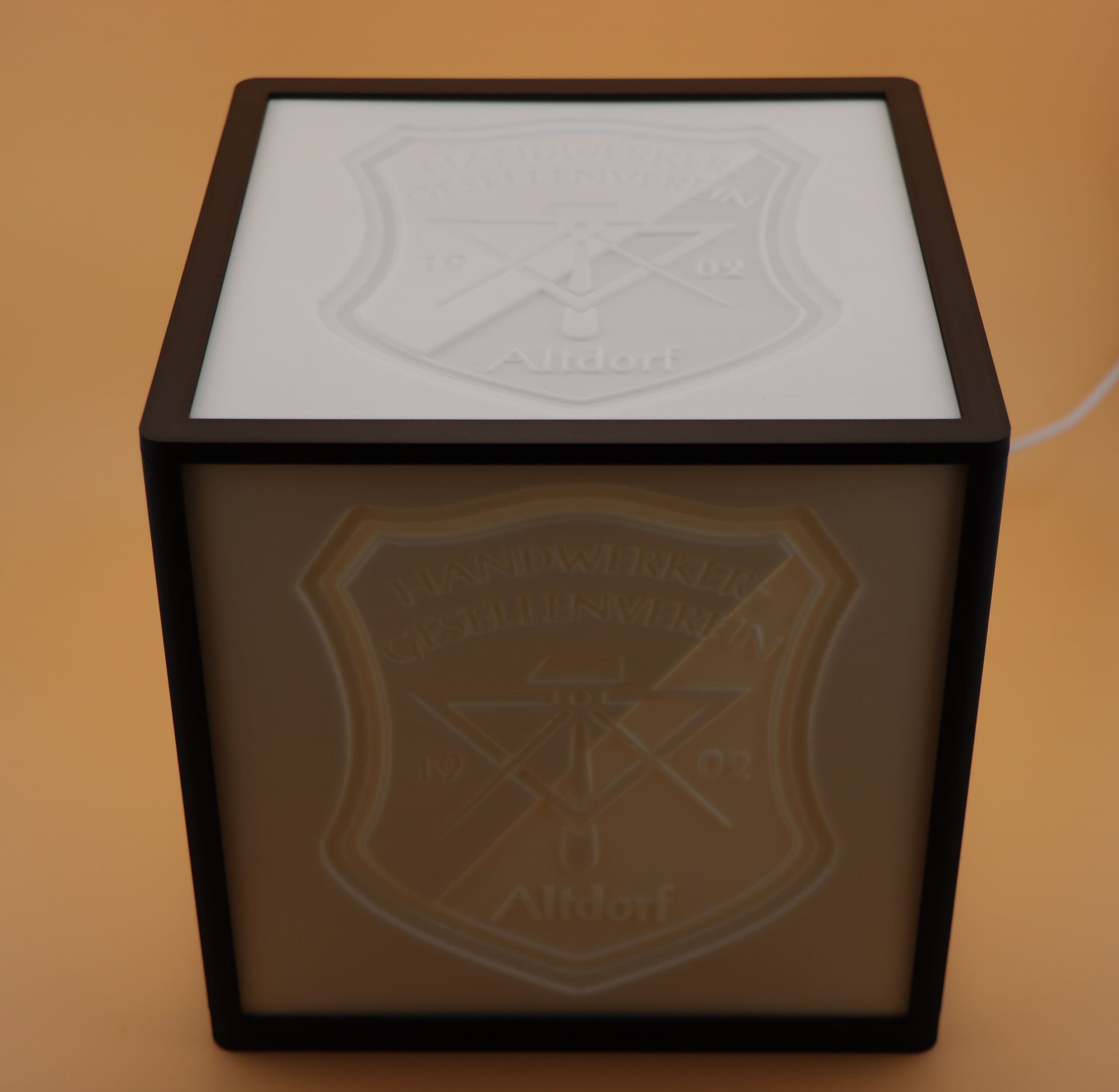 Dein individuell gefertigter Lithophane-Würfel ist vollständig montiert und wird inklusive LED-Spot mit USB-A-Kabelanschluss und Schalter geliefert.